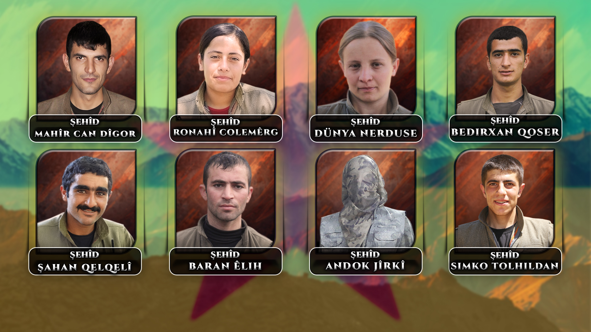 Hevrêyên me Ronahî, Dunya, Bedirxan, Mahîr, Baran, Andok, Simko û Şahan bi îradeya xwe ya xurt tevlî têkoşîna dijwar a sala 2019’an bûn. Bi cesaret û biryardariyeke mezin têkoşîn bi fedayiyane mezin kirin. Ji bo azadiya Rêber Apo û gelê Kurd xwe feda kirin. Em şehîdên xwe yên têkoşîna sala 2019’an ku mîmarên ronahiya siberoja me ne, bi hezkirin, rêzdarî û minetdarî bi bîr tînin. Em li ber bîranîna şehîdên xwe yên ezîz bi rêzdarî bejna xwe ditewînin. Em soz didin ku bi hêza ku me ji wan girtiye armancên wan bi ser bixin û meşa Rêbertiya Azad, Kurdistana Azad bi serketinê tacîdar bikin.