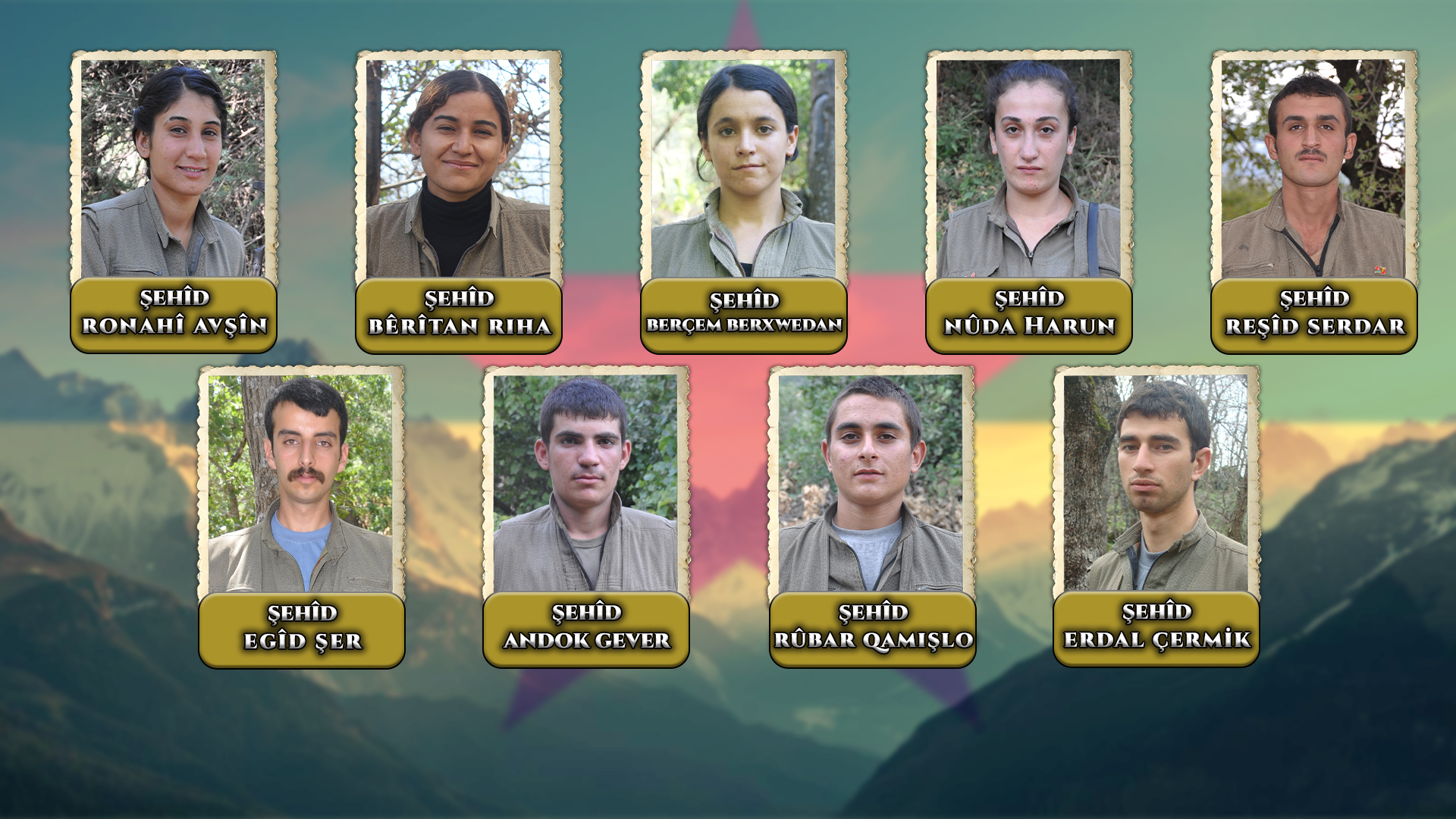 Hevrêyên me Erdal, Ronahî, Reşîd, Nûda, Rûbar, Bêrîtan, Berçem, Egîd û Andok ji bo jiyana azad a gelê me xwe kirin sîper û têkoşiyan. Li gel hemû êrîşên dijmin, tu carî ji helwesta xwe ya bi rûmet tawîz nedan. Bi ruhekî fedayî yê Apoyî meşiyan li ser şopa şehîdan. Hevrêyên me yên leheng, ku her yek ji wan şoreşgerên hêja bûn, her erka ku li ser milê wan bû bi cidiyet û hesasiyeteke mezin pêk anîn. Li herêmên cuda yên Kurdistanê bêhesab ked dan. Nîşanî ciwanên Kurdistanê dan ku riya rûmet û serketinê li çiyayên azad e. Çiyayên Kurdistanê kirin dergehê berxwedanê û erka parastina rûmet û şerefa gelê me bi cih anîn. Hevrêyên me yên fedayî yên ku tevlî karwanê şehîdan bûn, wê bi şêwaza jiyana xwe ya Apoyî, hevrêtiya xwe ya kûr û helwesta xwe ya bi prensîb bên bîranîn. Em wekî hevrêyên wan, soz didin ku alaya têkoşînê ya ku hevrêyên me Erdal, Ronahî, Reşîd, Nûda, Rûbar, Bêrîtan, Berçem, Egîd û Andok dewrî me kirine, em ê bi serketinê bilind bikin.