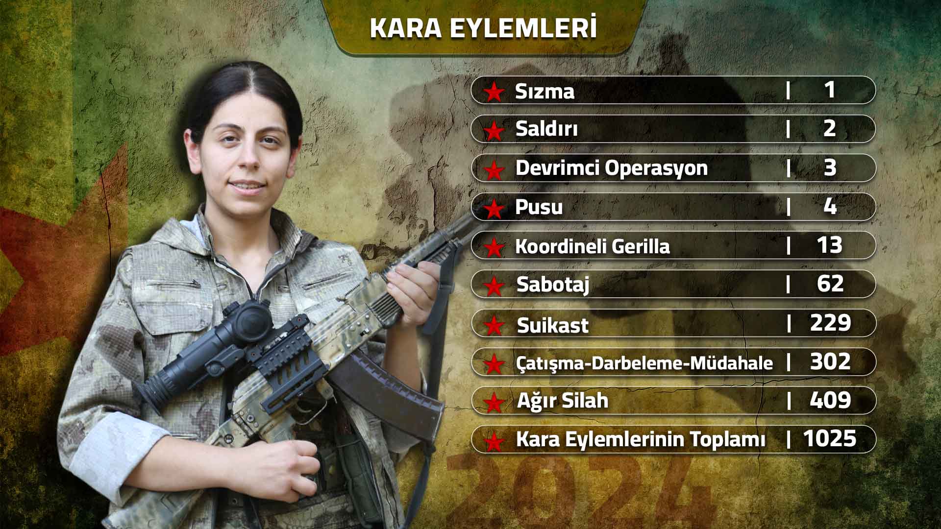 2024 yılında işgalci Türk ordusu Bakurê Kurdistan’da istihbarat ve tekniğe dayalı saldırılarını sürdürmüş ve bu şekilde sonuca ulaşmaya çalışmıştır. Önceki yıllarda Bakurê Kurdistan’daki gerilla varlığını tasfiye edeceğini belirtip ham hayaller peşine düşen ve bunun için çeşitli tarihler veren sömürgeci soykırımcı Türk devleti, gerillanın kararlı mücadelesi karşısında bu amacına artık ulaşamayacağını anladığı için bu söylemi dilinden düşürmek zorunda kalmıştır. Gerillanın dönem ruhuna uygun geliştirdiği taktik ve stratejik açılımların düşman planlarını sonuçsuz bıraktığı, 2024 yılı mücadelesinde çok net bir biçimde açığa çıkmıştır. Bu önemli ve tarihi sonucu açığa çıkaran da; Dersîm’de Edessa Cejna, Botan’da Bêrîtan Nurhak Çiya, Herekol Şiyar, Brûsk Kato, Benda Amed ve Serhat Jêhat, Mêrdîn’de Mehmet Cûdî ve Zerdeşt Suruç, Serhed’de Şêxmûs Malazgirt ve Berwar Dersîm, Amed’de Hebûn Pîro ve Botan Osyan, Wan’da Zagros Cûdî gibi fedai ve yiğit komutanlarımız öncülüğünde gelişen gerillanın kahramanlık duruşu olmuştur. 2024 yılı mücadelesinde Bakurê Kurdistan’da 36 yoldaşımız kahramanca savaşarak şehadete ulaşmıştır.